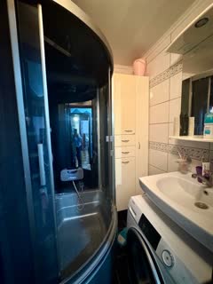 Раздельный санузел. На стенах кафельная плитка. В ванной установлена душевая кабина.